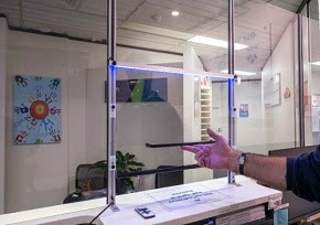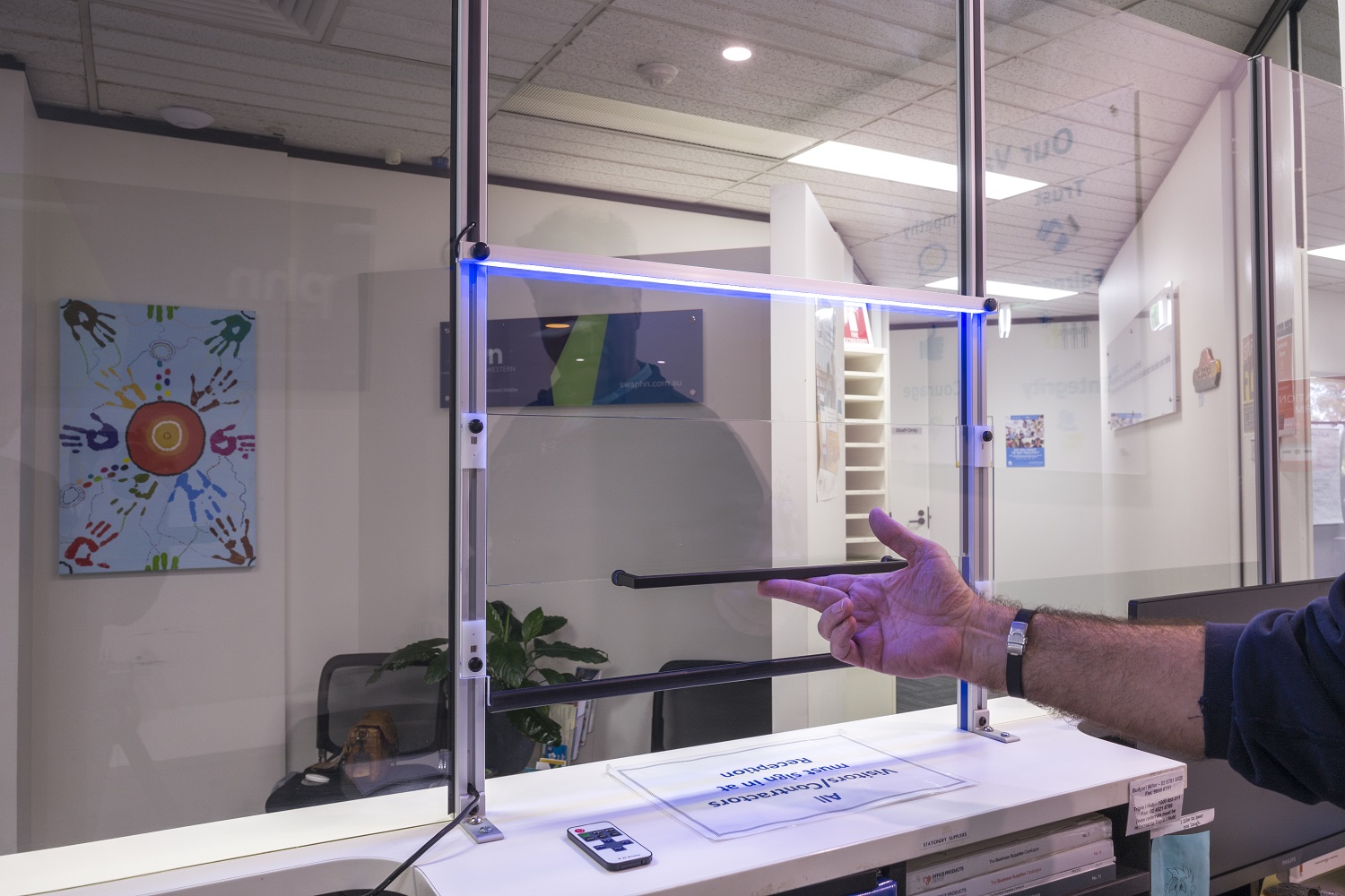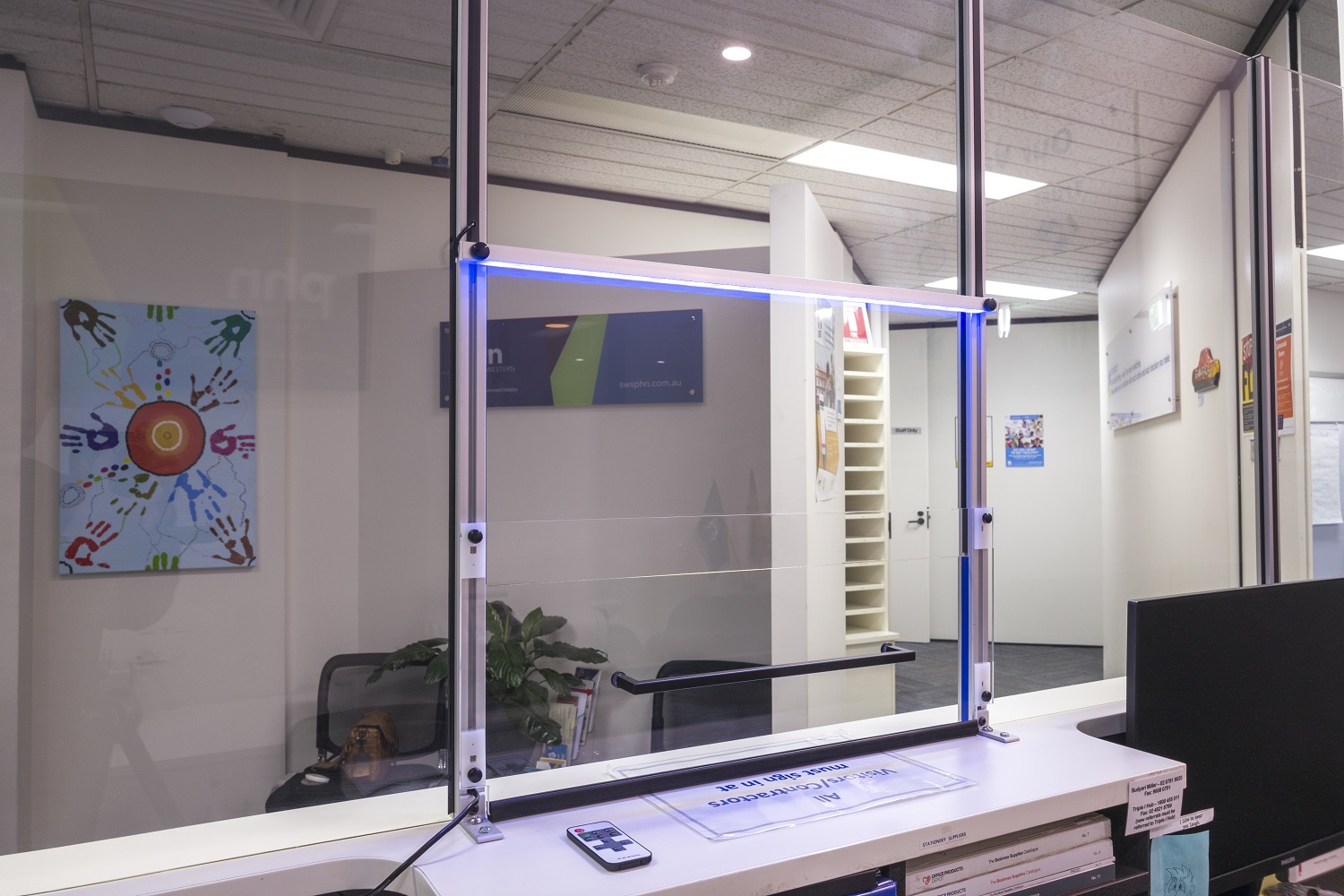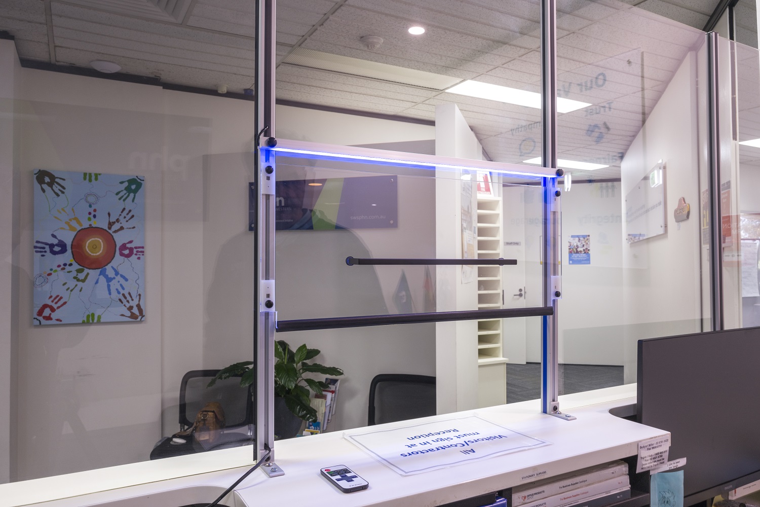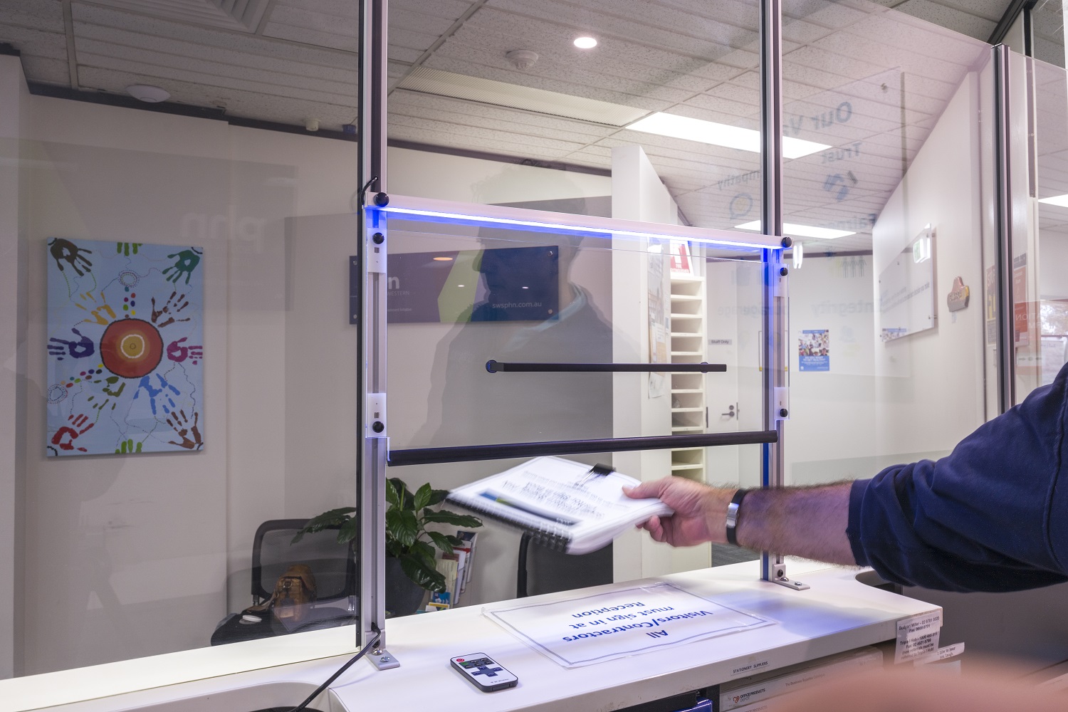 A UV-A Light Bar is provided above the “handover” and other client access areas to improve safety and disinfect all critical spots. The low-voltage powered device is safely wired and connected to a power source below reception area.
