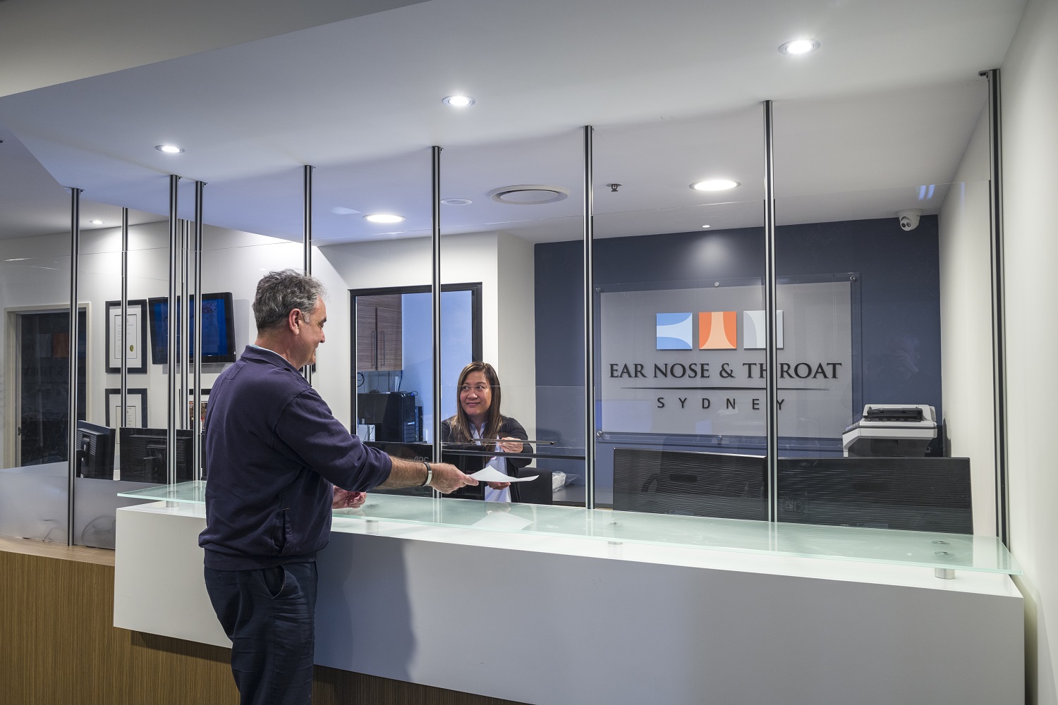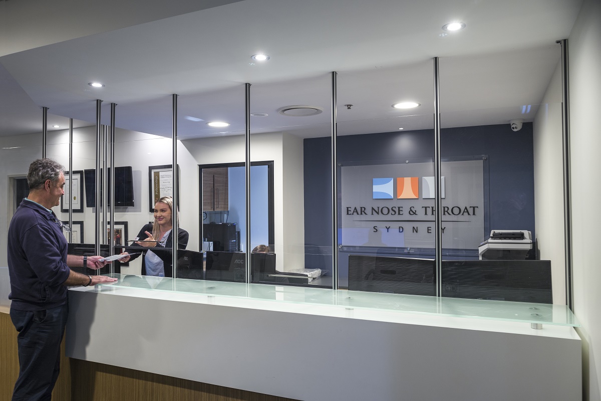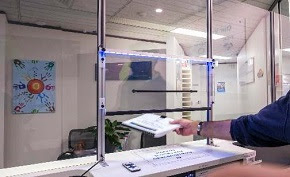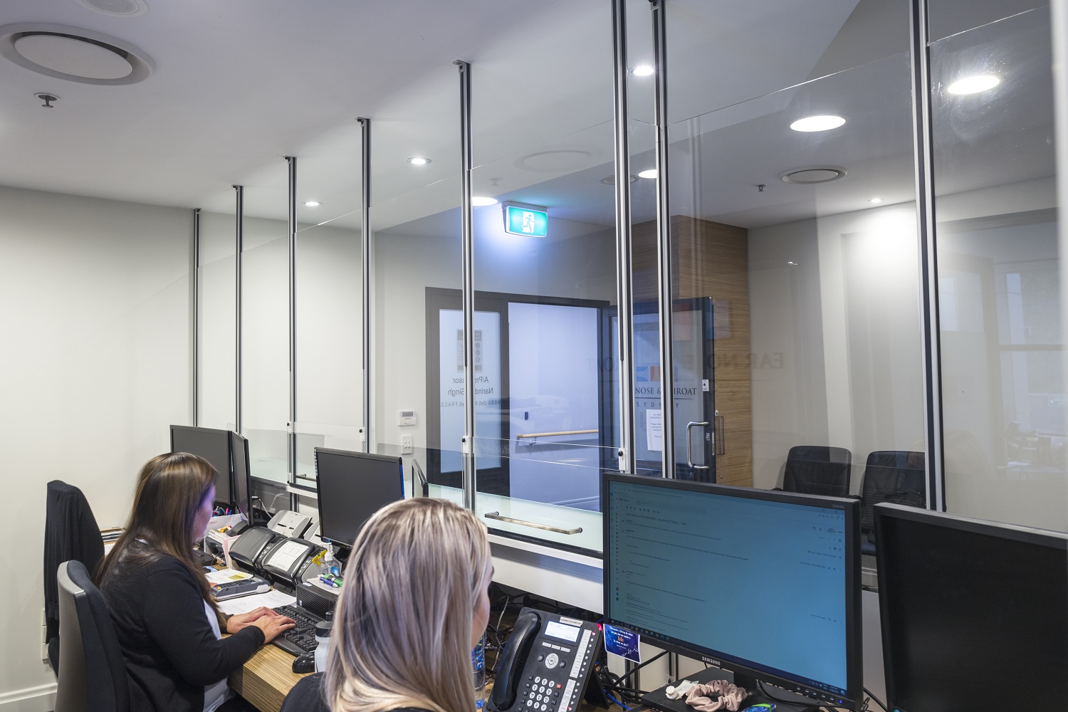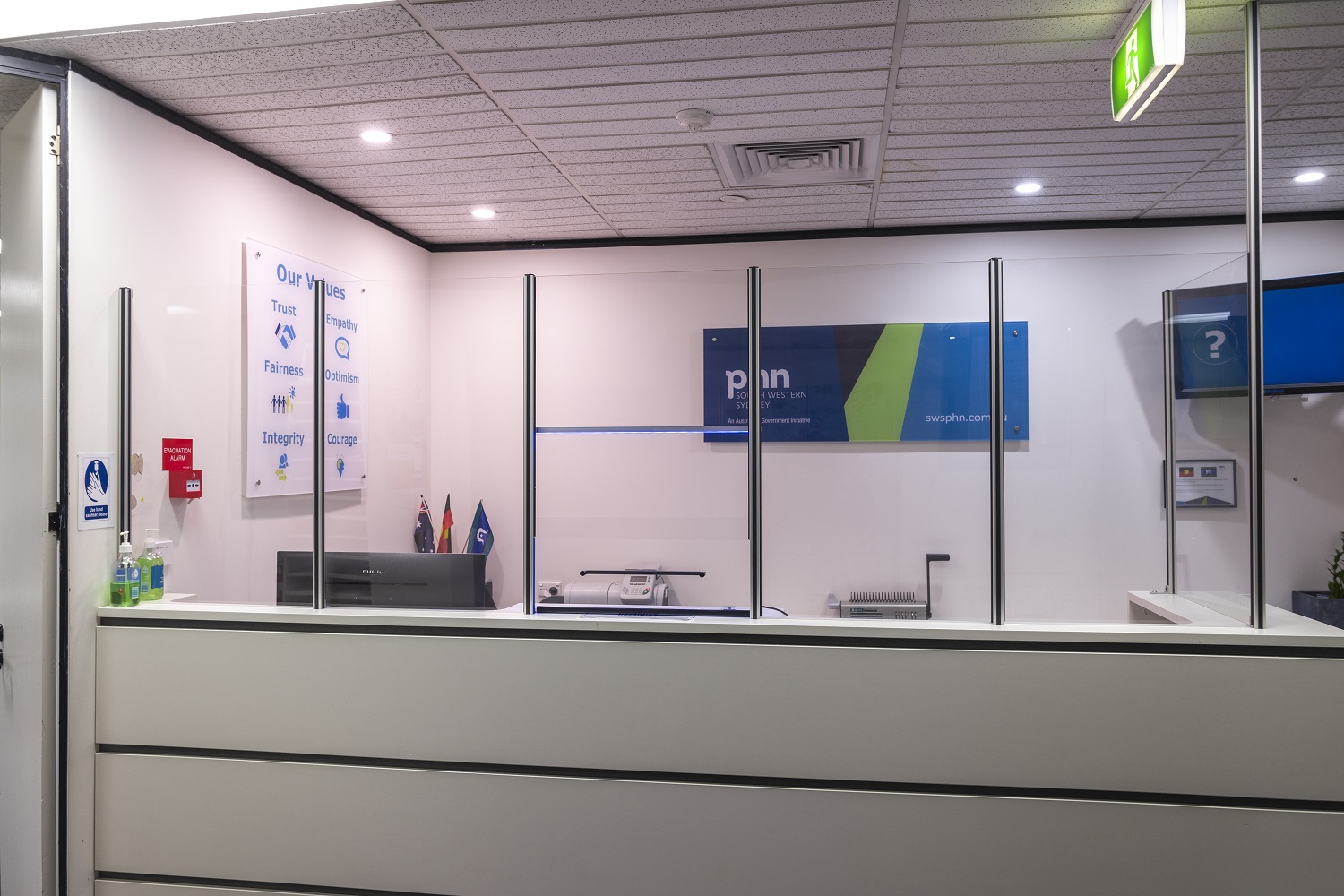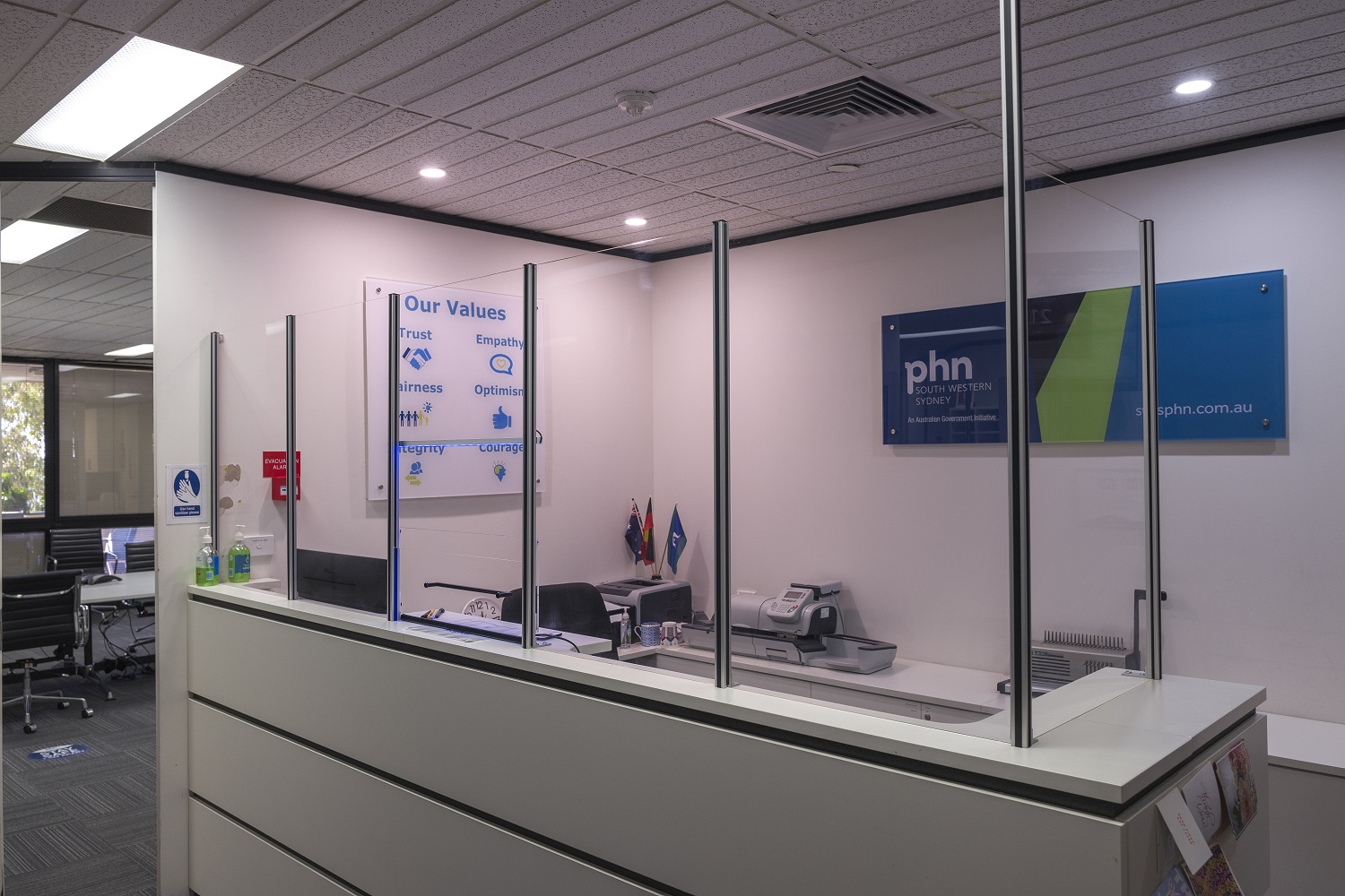 The aluminium extrusions can be fixed to reception level up to the ceiling (see cover page photo) or fixed safely only to your reception desk as shown on the image below. Acrylic glass is then cut to height ensuring staff protection (usually about 1.9-2.0m from the ground level) and allowing the two-way communication without obstructions. The whole structure is built with integrity and designed as required by OHSAS ISO 18001. No sharp edges exposed, all slots and gaps covered with rubber gaskets and plastic covers. The “handover area” can be supplied with or without sliding doors, to enhance safety of clients and office staff.